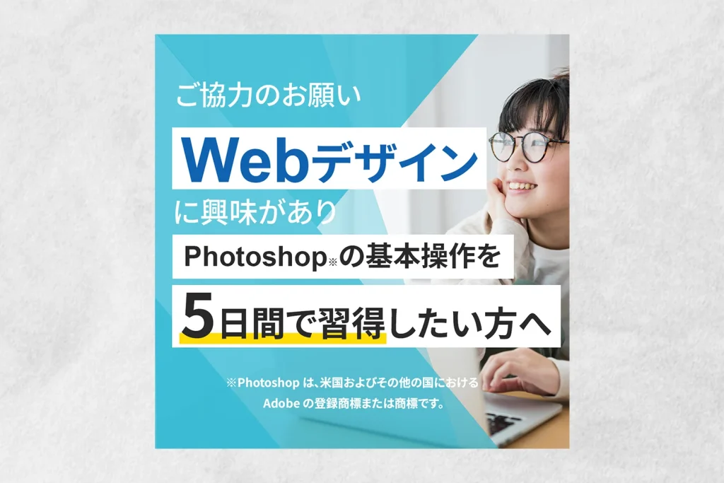 信頼感のイメージのある青色をベースにデザインしました。明るめの青色を使うことにより爽やかさを出しました。文字を大きくし、人目を引く黄色のラインを入れることで「webデザイン」の広告で、「5日間で習得できる」ことを一目で分かるよう工夫しました