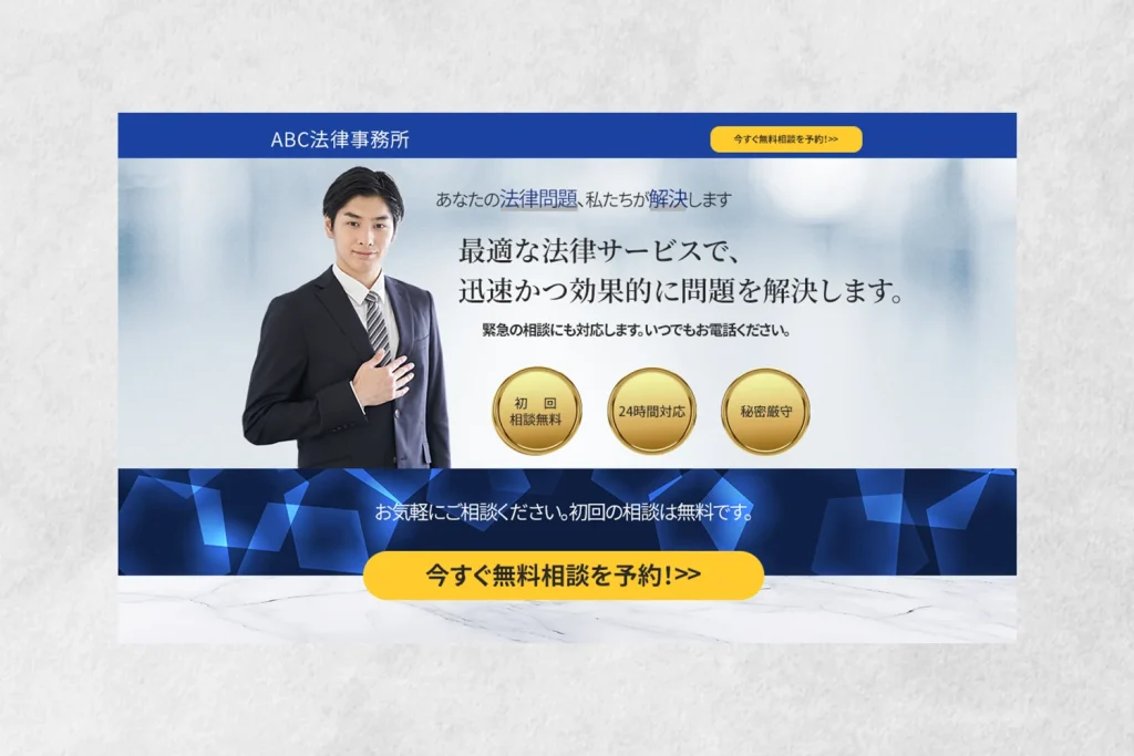濃い青を基調にゴールドを加え、明朝体を採用することで高級感と信頼性を表現しました。胸に手を当てる人物写真を用いることで誠実さや安心感を訴求し、「初回相談無料」「24時間対応」「秘密厳守」といった安心材料を目立たせて信頼性を補強しています。問い合わせ向上を目的にボタンを2か所に配置し、最後に黄色のCTAボタンで強く行動を促す構成がポイントです。